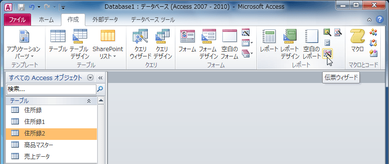 - 対象となる住所録のテーブルまたはクエリを選択して[作成]タブの[レポート]グループの[伝票ウィザード]をクリックします。