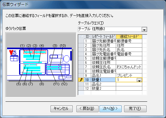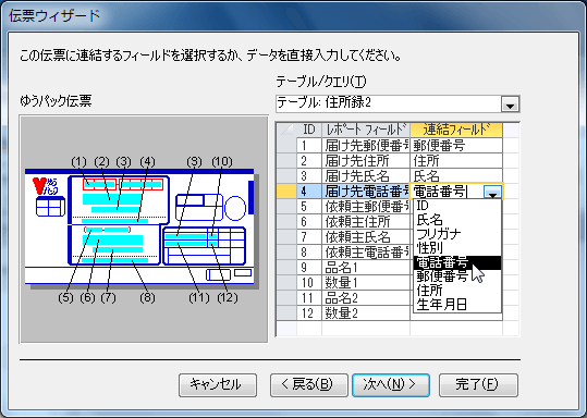 - 伝票に連結するフィールドを選択していきます。