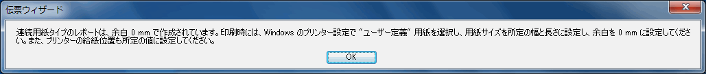 ただし、連続用紙タイプのレポートは、余白0mmで作成されています。印刷時には、Windowsのプリンター設定で"ユーザー定義"用紙を選択し、用紙サイズを所定の幅と長さに設定して、余白を0mmに設定する必要があります。また、プリンターの給紙位置も所定の値に設定します。