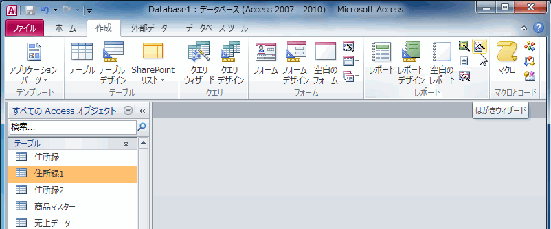 - 対象となる住所録テーブルまたはクエリを選択し、[作成]タブの[レポート]グループの[はがきウィザード]をクリックします。