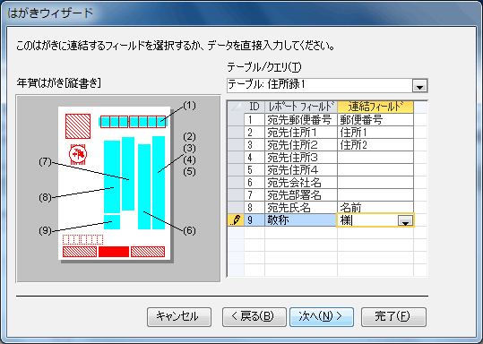 - はがきに連結するフィールドを選択するか、データを直接入力して[次へ]ボタンをクリックします。