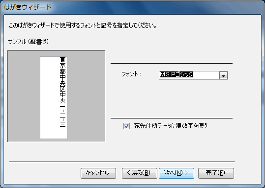 - 縦書きの場合、宛先住所データに漢数字に変換できます。必要に応じてフォントを指定して[次へ]ボタンをクリックします。