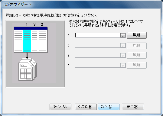 - もし詳細レコードの並べ替えをしたい場合は、フィールドを選択して昇順または降順を指定して[次へ]ボタンをクリックします。