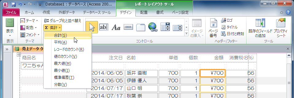 フィールドに集計を追加して、フィールドの合計、平均、カウント、またはその他の集計などを計算するには、レイアウトビューでレポートを開き、対象となるフィールドの任意の値を選択して、[レポートレイアウトツール]の[デザイン]タブの[グループ化と集計]グループで[集計]をクリックし、集計方法を選択します。レポートの末尾には総計、レポート上の任意のグループにはグループの集計が追加されます。