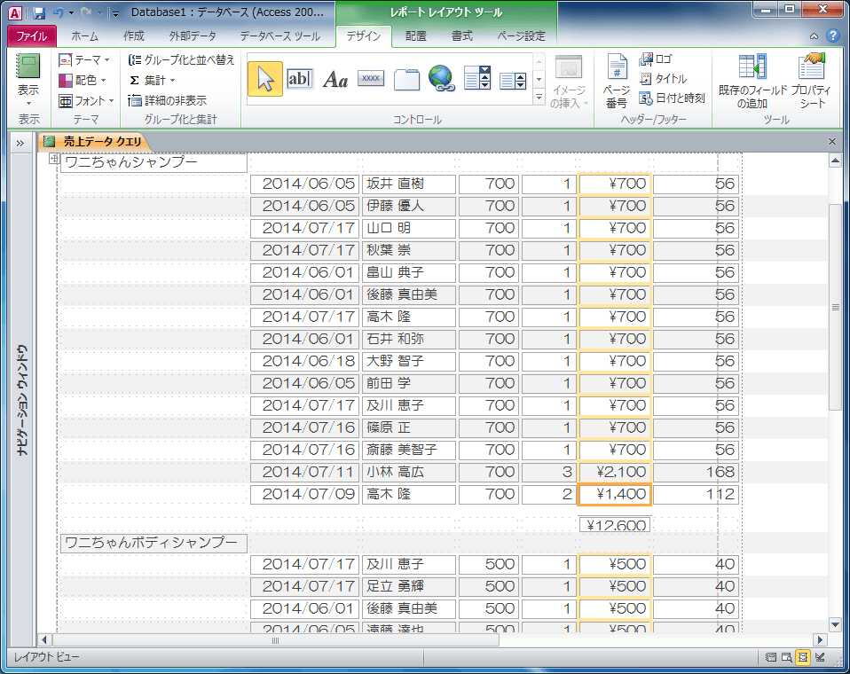- 金額フィールドの任意の値を選択し、[レポートレイアウトツール]の[デザイン]タブを開きます。