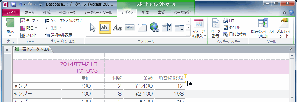 レイアウトビューでレポートを開き、[レポートレイアウトツール]の[デザイン]タブの[コントロール]グループからテキストボックスを選択して、挿入したい場所を指定します。