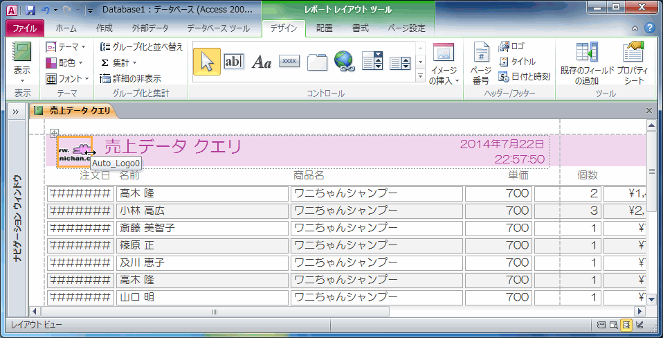 - [レポートレイアウトツール]の[デザイン]タブを開き、[ヘッダー/フッター]グループの[ロゴ]を選択します。