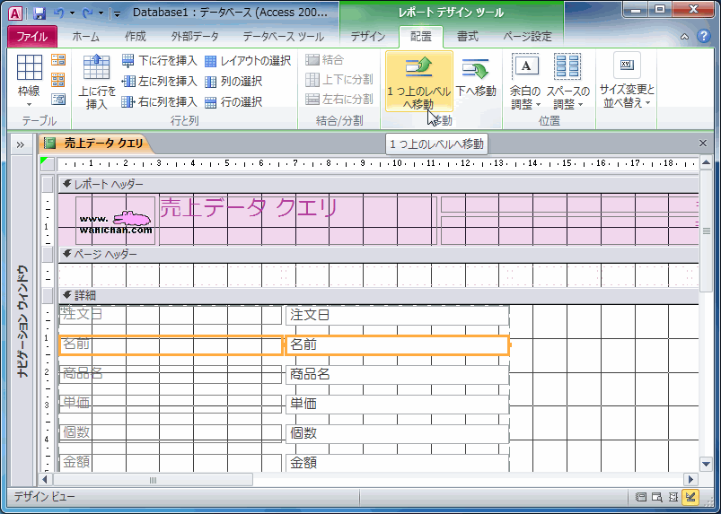 テーブルの行単位でレポートコントロールを上または下へ移動するには、移動したいコントロールを選択し、[レポートレイアウトツール]の[配置]タブを開いて、[移動]グループから[一つ上のレベルへ移動]または[下へ移動]を選択します。