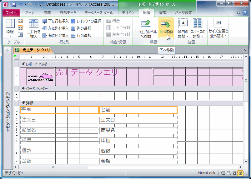 - [レポートレイアウトツール]の[配置]タブを開きます。