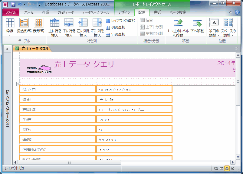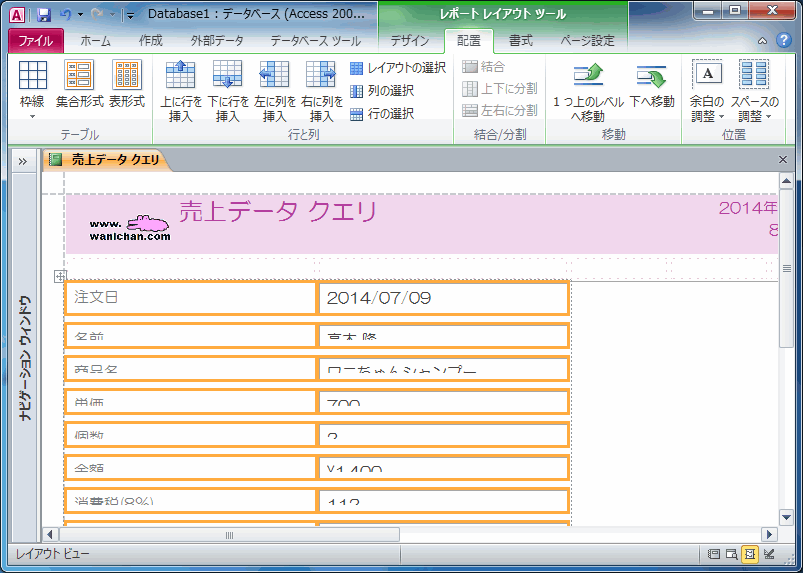 - [レポートレイアウトツール]の[配置]タブを開き、対象となるコントロールを選択します。