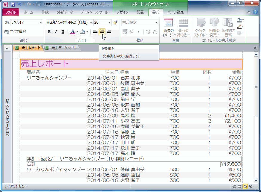 [レポートデザインツール]の[書式]タブの[フォント]グループには、文字配置を変更するコマンドがあります。