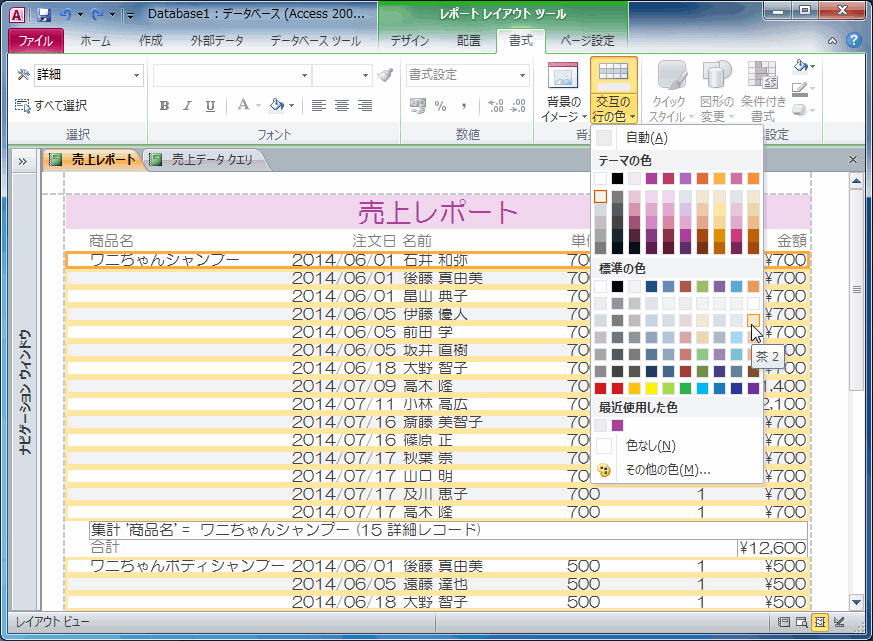 レイアウトビューまたはデザインビューに切り替えて、[レポートデザインツール]の[書式]タブを開き、[背景]グループの[交互の行の色]一覧から色を選択します。