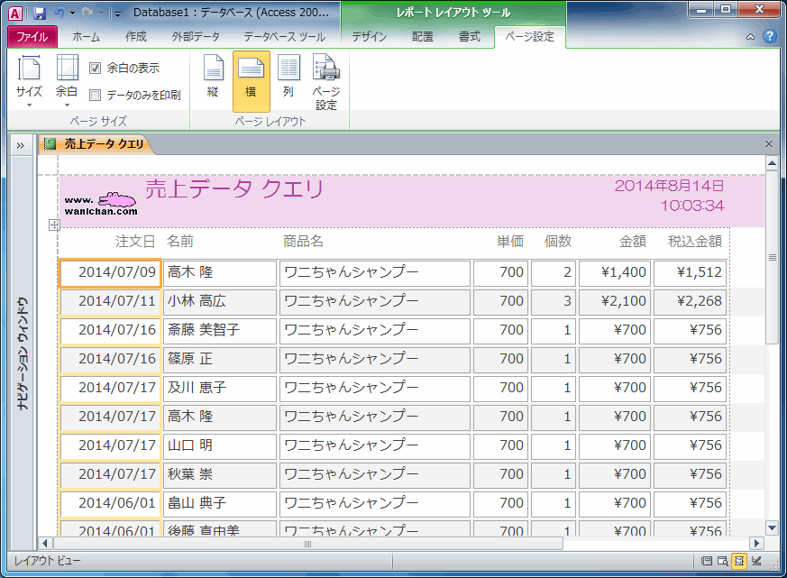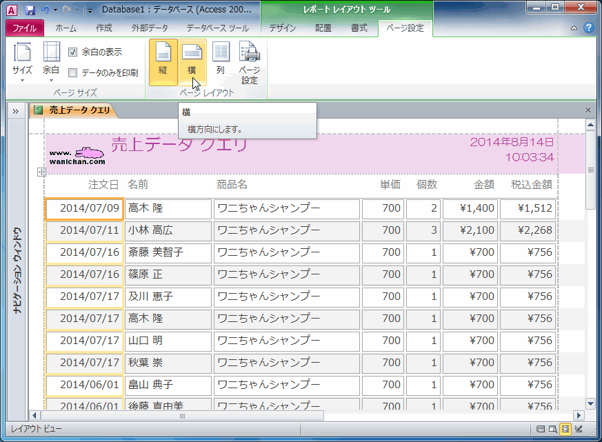- [レポートデザインツール]の[ページ設定]タブを開いて、[ページレイアウト]グループより[横]を選択します。