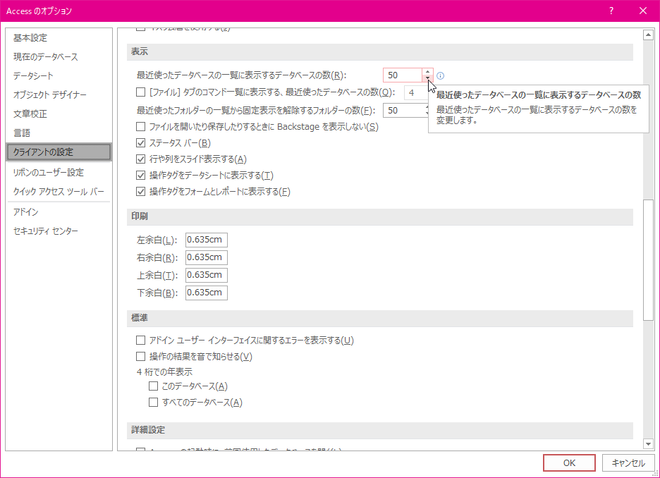 Access 2016の既定の最近使ったデータベースの一覧に表示するデータベースの数は50です。これを任意の数に変更できます。コマンド一覧の[オプション]をクリックして[Accessのオプション]を開き、[クライアントの設定]メニューの[表示]グループにて、[最近使ったデータベースの一覧に表示するデータベースの数]の数値を変更します。