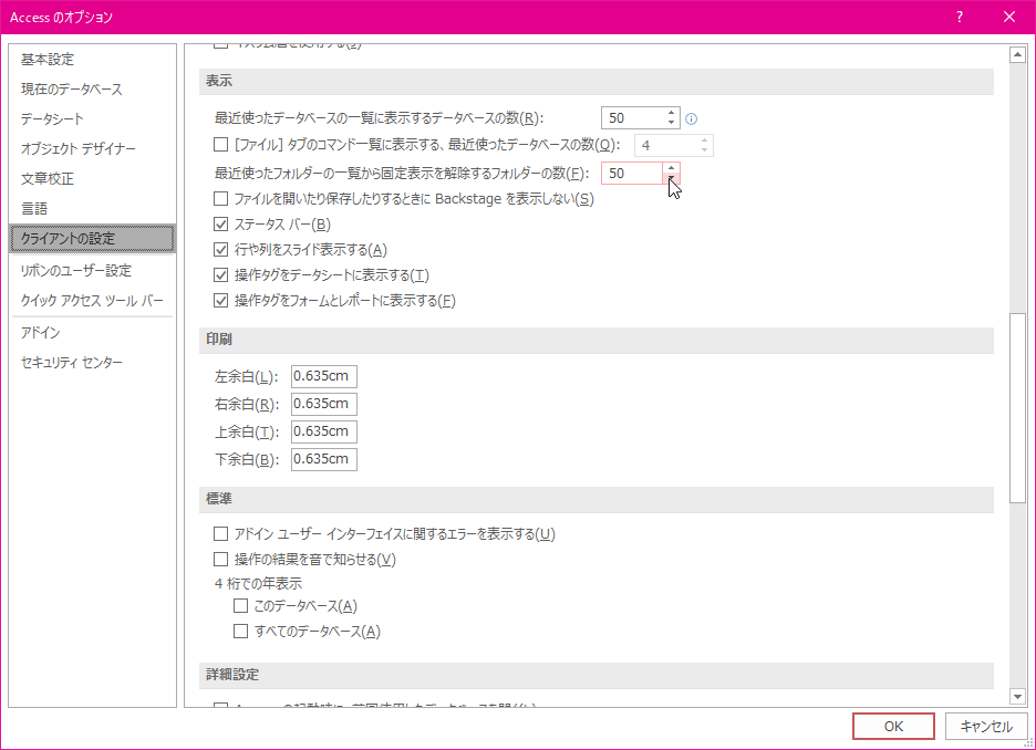 Access 2016の既定の最近使ったフォルダーの一覧から固定表示を解除するフォルダーの数は50です。これを任意の数に変更できます。コマンド一覧の[オプション]をクリックして[Accessのオプション]を開き、[クライアントの設定]メニューの[表示]グループにて、[最近使ったフォルダーの一覧から固定表示を解除するフォルダーの数]の数値を変更します。