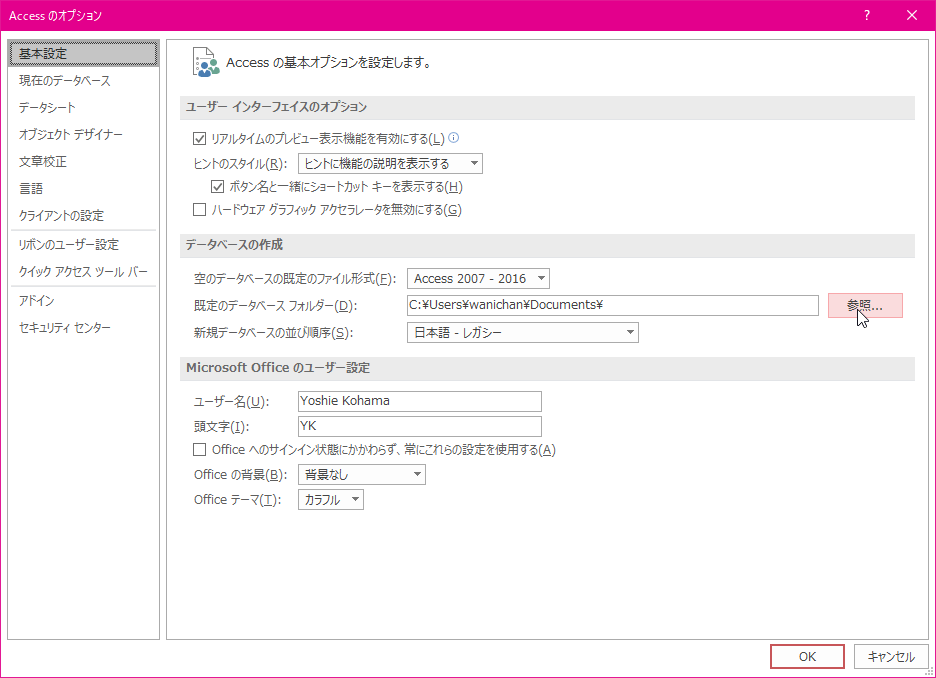 Access 2016で新しいデータベースを作成する既定のデータベースフォルダーは、ユーザー名がwanichanの場合「C:\Users\wanichan\Documents\」です。新規データベースの場所を変更するには、[ファイル]タブをクリックしてコマンド一覧から[オプション]を選択し、[Accessのオプション]の[基本設定]にて[データベースの作成]オプションの[既定のデータベースフォルダー]よりフォルダーを指定します。