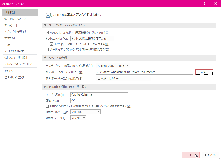 - [Accessのオプション]の[基本設定]を開きます。