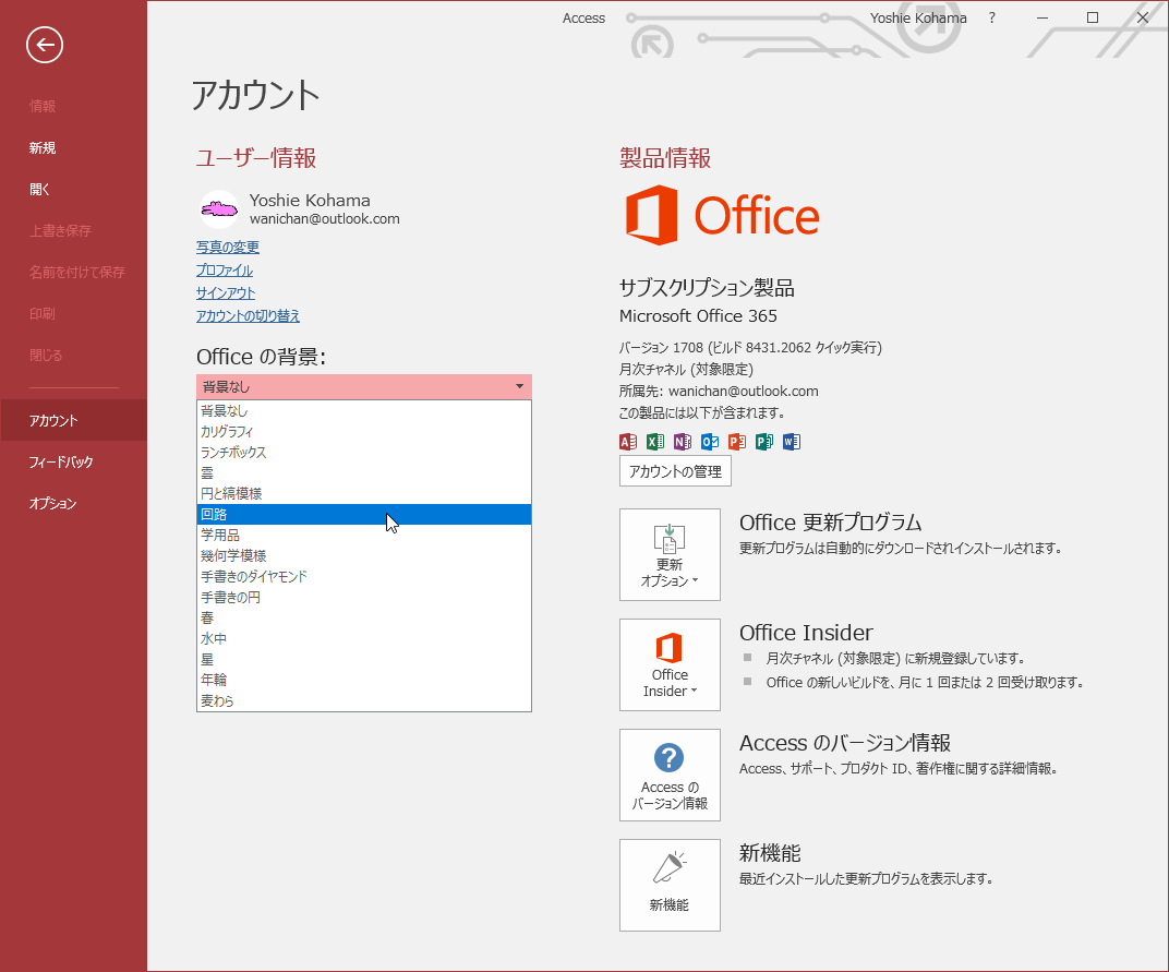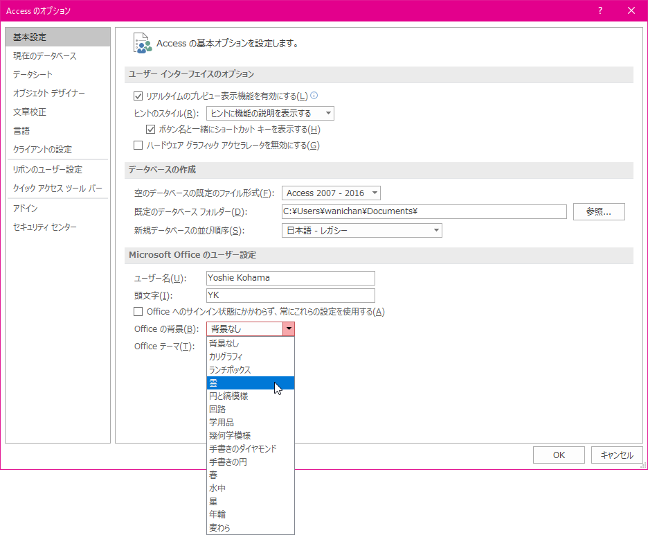[ファイル]タブからコマンド一覧より[アカウント]を選択するか、[Accessのオプション]ダイアログボックスの[基本設定]タブの[Microsoft Officeのユーザー設定]グループにて、[Officeの背景]一覧より選択します。この設定を変更することにより、Access 2016に限らず、Office 2016のすべてのアプリケーションの背景が変更されます。
