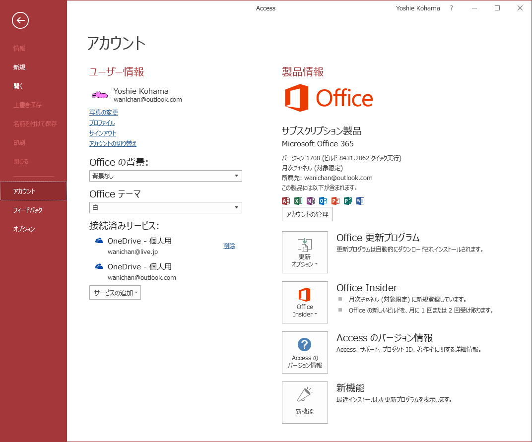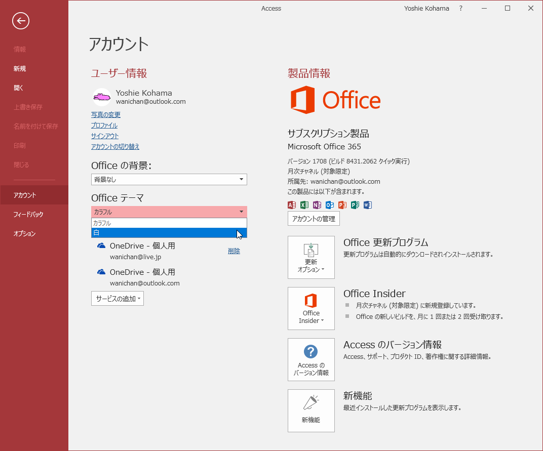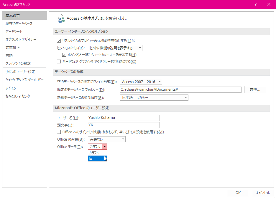 既定のOffice 2016のテーマは「カラフル」です。「白」にすることで、Office 2013と同じスタイルにできます。[ファイル]タブからコマンド一覧より[アカウント]を選択するか、[Accessのオプション]ダイアログボックスの[基本設定]タブの[Microsoft Officeのユーザー設定]グループにて、[Officeのテーマ]一覧より選択します。この設定を変更することにより、Access 2016に限らず、Office 2016のすべてのアプリケーションのテーマが変更されます。