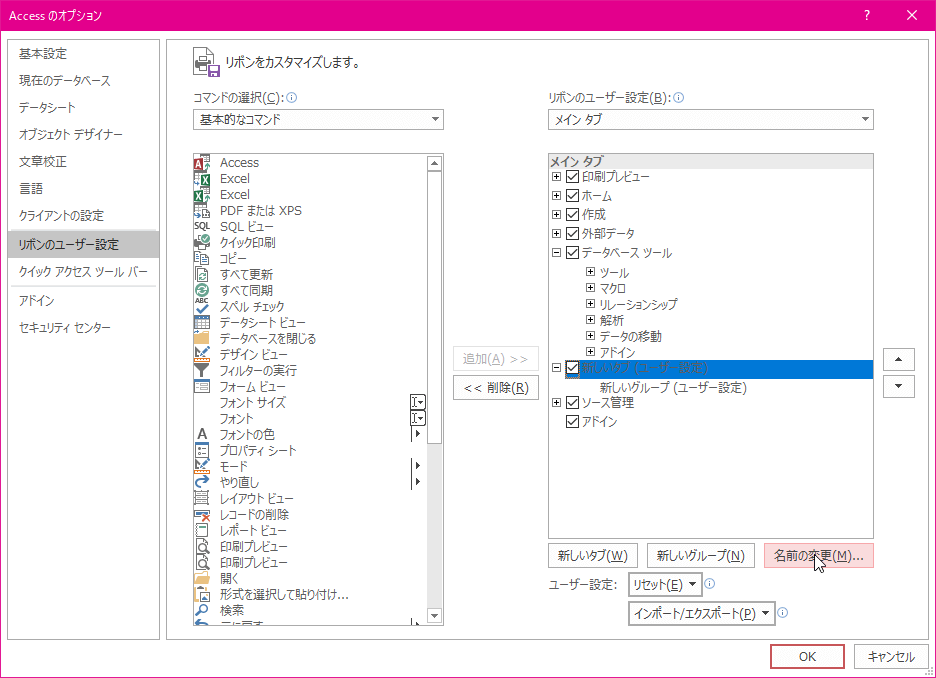 - [Accessのオプション]ダイアログボックスの[リボンのユーザー設定]を開きます。