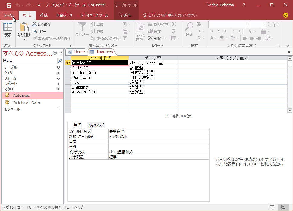 Access 2016を終了させずに、データベースだけを閉じるには、[ファイル]タブを開き、[閉じる]をクリックします。