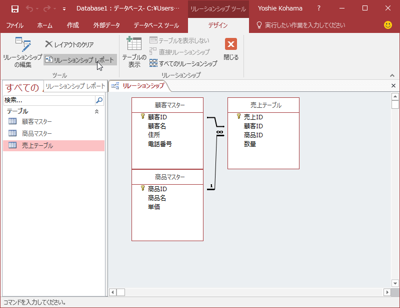- [デザイン]タブの[ツール]グループにある[リレーションシップ レポート]をクリックします。