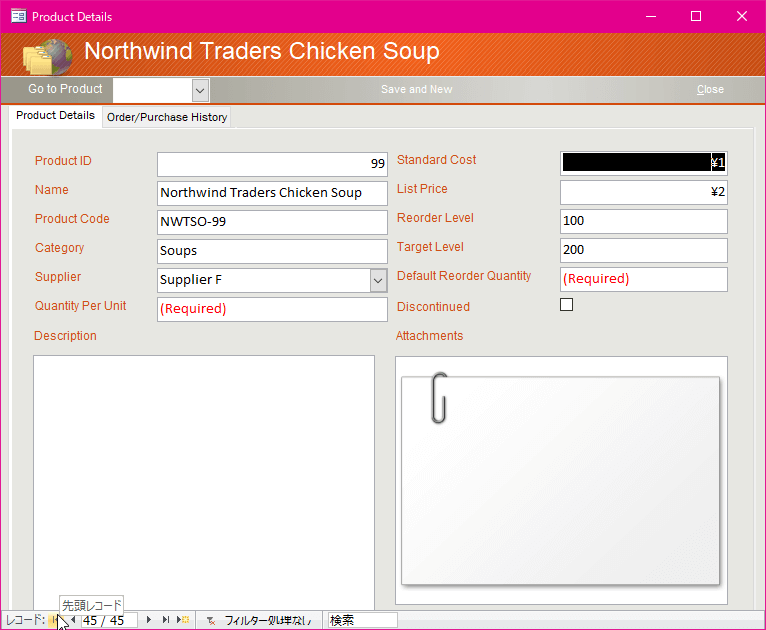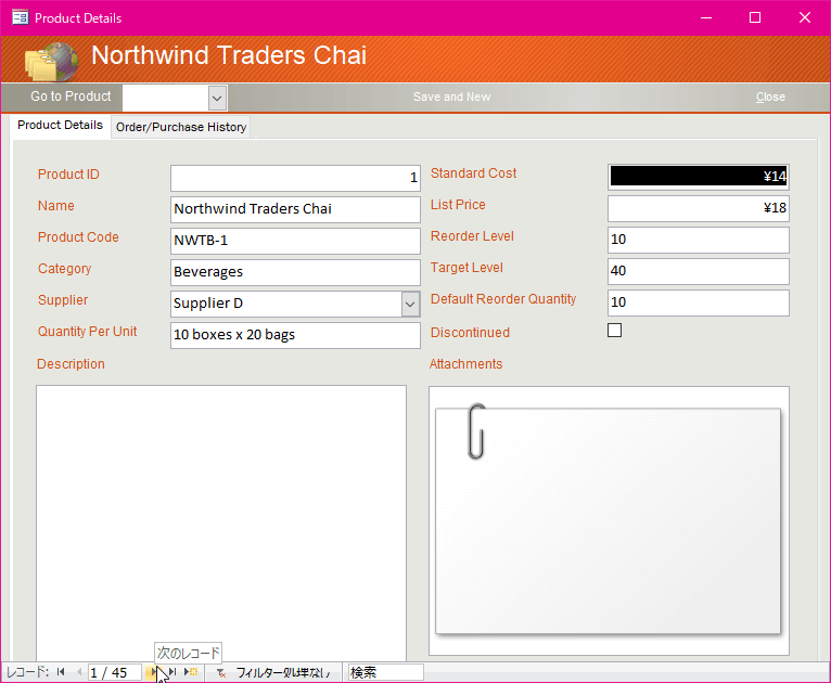 下の図は、サンプルテンプレートの「ノースウィンド 2007」の「Product Details」を開いたときのレコードセレクタです。この例では全45件中の1件目のレコードが表示されています。