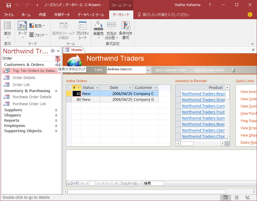 ナビゲーションウィンドウの上部の検索ボックスを使って、オブジェクトを検索することができます。ここではサンプルテンプレート「ノースウィンド 2007」を使って、「Order」を含むオブジェクトを検索してみましょう。