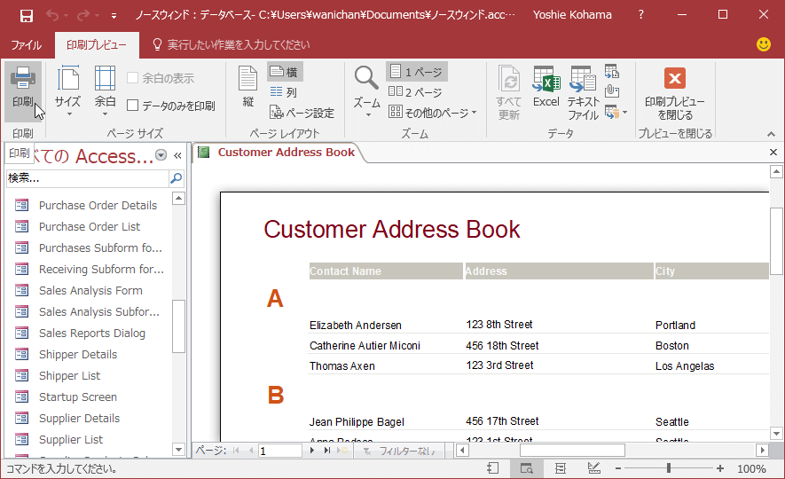 ノースウィンド2007のサンプルデータベースの用紙サイズは「Letter」になっているため、印刷プレビュー時に以下のメッセージが表示されます。