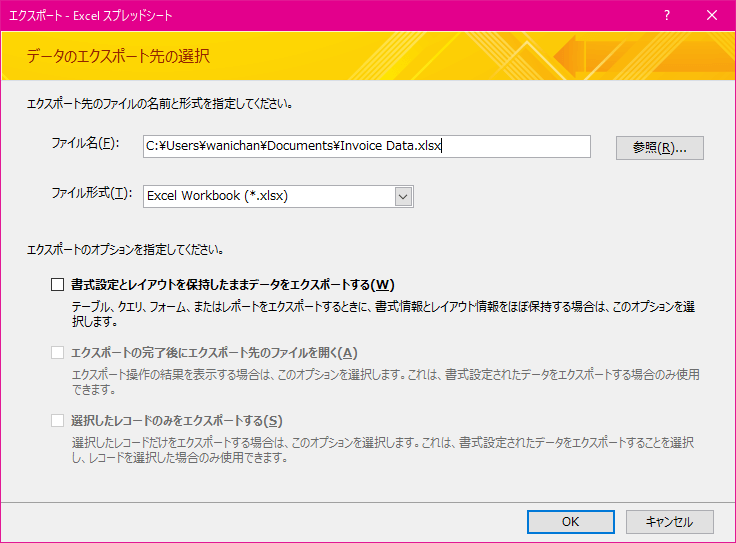 - 必要に応じてエクスポートのオプションを指定して[OK]ボタンをクリックします。