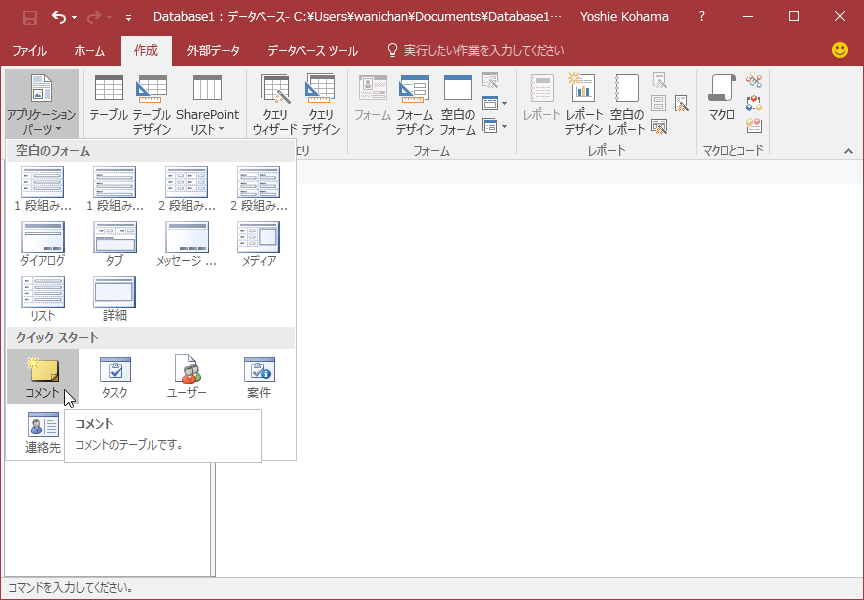 Access 2016には、データベースの一部またはデータベースアプリケーション全体を挿入または作成できる「アプリケーションパーツ」というテンプレートが用意されています。そのなかの「クイックパーツ」の一覧から汎用的なテーブルを素早く作成できます。ここでは、コメントのテーブルを素早く作ってみましょう。