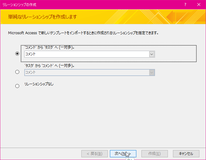 - [リレーションシップの作成]ウィザードが表示されます。とりあえずこのままの状態で次へ進みます。