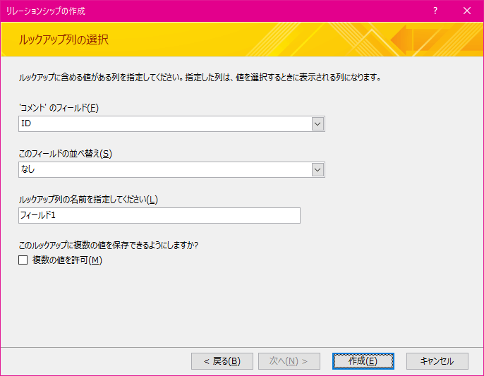 - ルックアップ列に含める値を指定し、複数の値を許可するかどうかを設定して[作成]ボタンをクリックします。