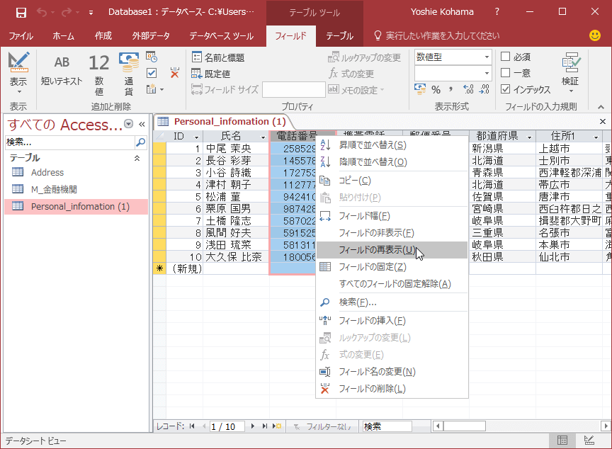 - [ホーム]タブの[レコード]グループの[その他]をクリックして[フィールドの再表示]を選択するか、任意のフィールドを右クリックして、ショートカットメニューより[フィールドの再表示]をクリックします。