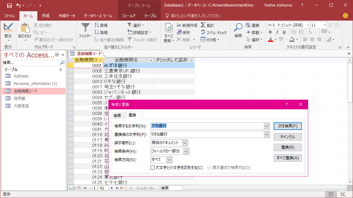 [ホーム]タブの[置換]をクリックして[検索と置換]ダイアログボックスを表示し、検索する文字列を入力し、置換後の文字列を入力し、[すべて置換]します。探す場所を「現在のドキュメント」にするとテーブル全体から検索できます。置換のショートカットキーはCtrl+Hです。検索方向を[フィールドの一部分]にすると確実かもしれません。
