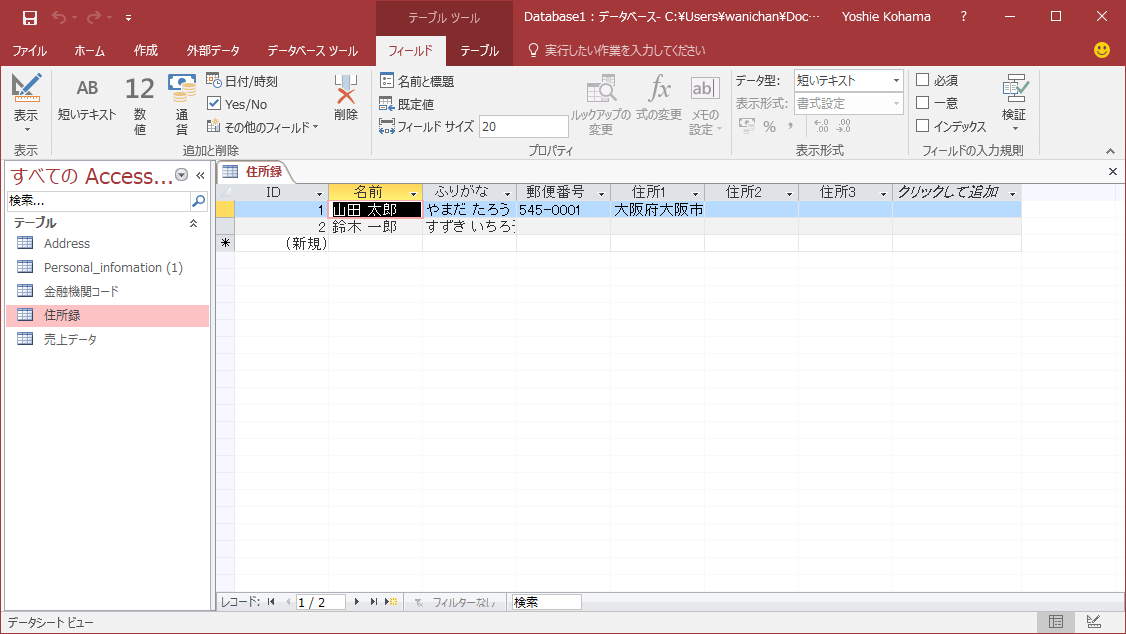 [テーブルツール]の[フィールド]タブを開き、[プロパティ]グループの[フィールドサイズ]ボックスに数値を入力します。テキスト型は255バイトまでです。小さくすることでデータベースのサイズを節約できます。必要最小限に変更しておきましょう。