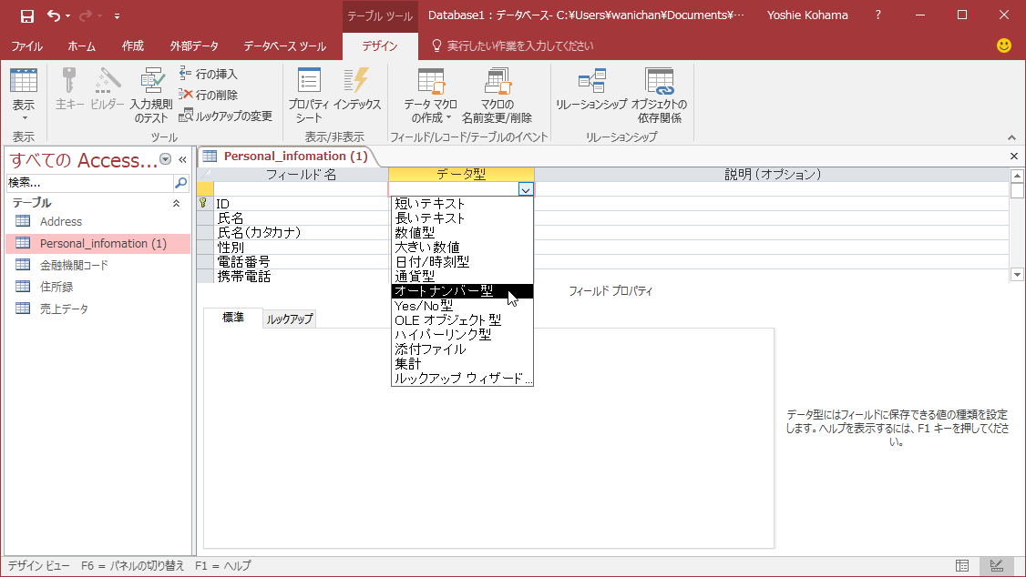 オートナンバー型のフィールドを追加する