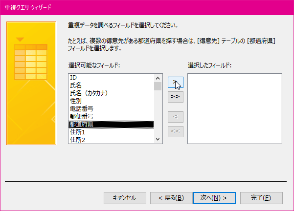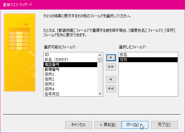 - 重複データを調べるフィールドを選択して[次へ]ボタンをクリックします。