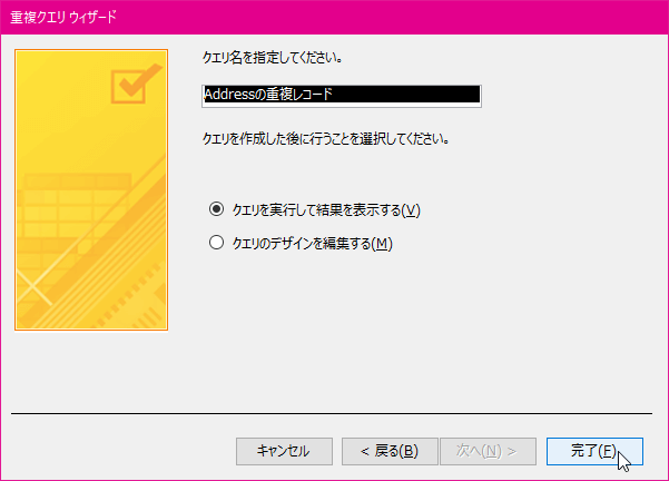 - クエリ名を指定します。クエリを作成した後に行うことを選択して[完了]ボタンをクリックします。
