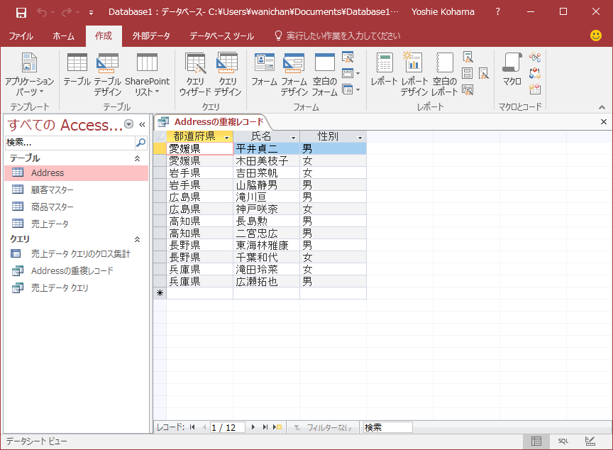 ここでは、同じ都道府県の氏名と性別を抽出する重複クエリを作成してみましょう。