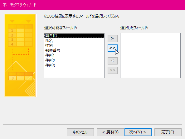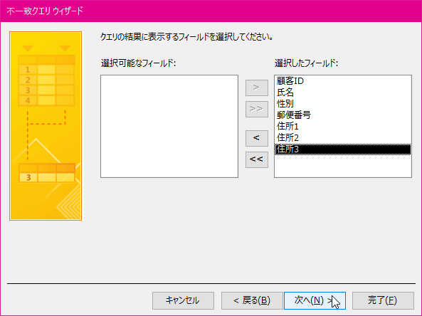 - クエリの結果に表示するフィールドを指定して[次へ]ボタンをクリックします。
