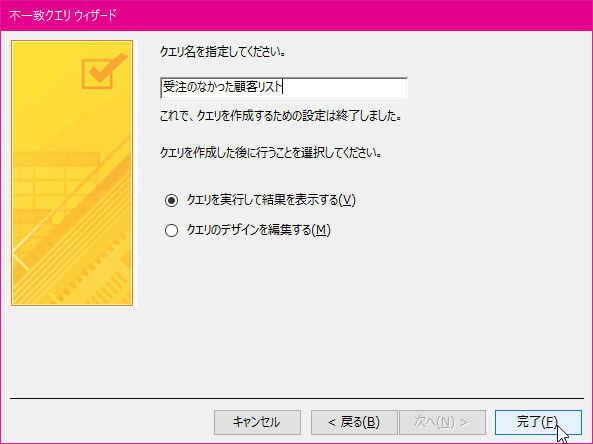 - クエリ名を指定します。クエリを作成した後に行うことを選択して[完了]ボタンをクリックします。