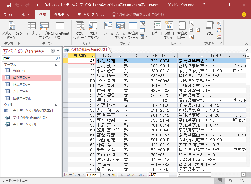 - [作成]タブを開き、[クエリ]グループの[クエリウィザード]を選択します。