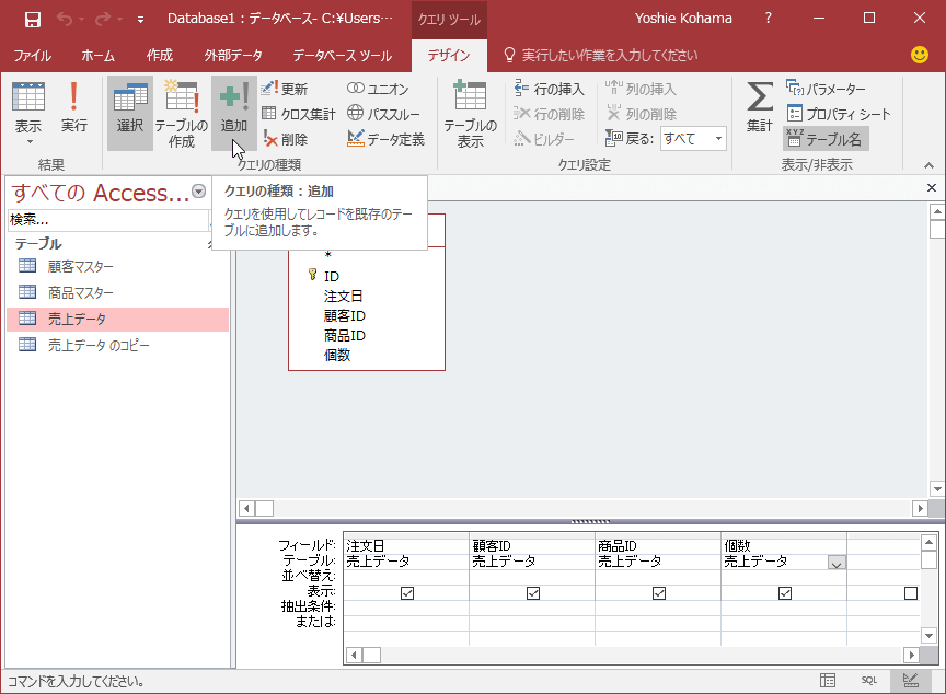 - [クエリツール]の[デザイン]タブを開いて、[クエリの種類]グループの[追加]を選択します。