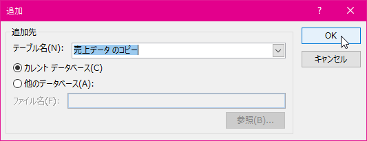 テーブルの名を指定します。現在開いているデータベースにテーブルを作成するには[カレントデータベース]を選択して[OK]ボタンをクリックします。