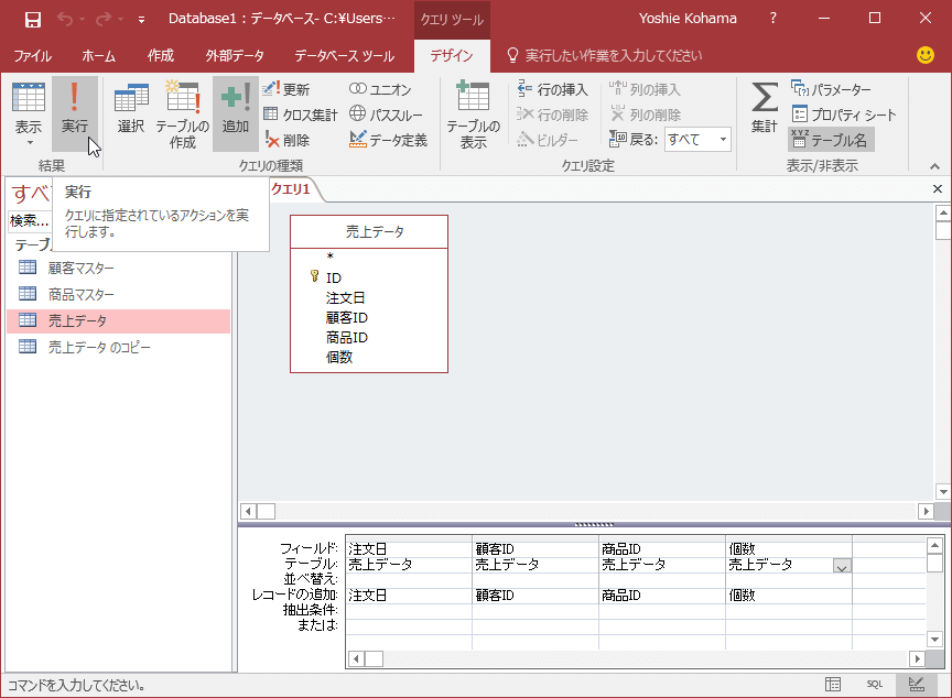 - [クエリツール]の[デザイン]タブにある[クエリの実行]をクリックします。