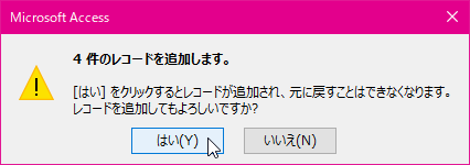 - レコードを追加するメッセージが表示されます。追加してもいい場合は[はい]ボタンをクリックします。