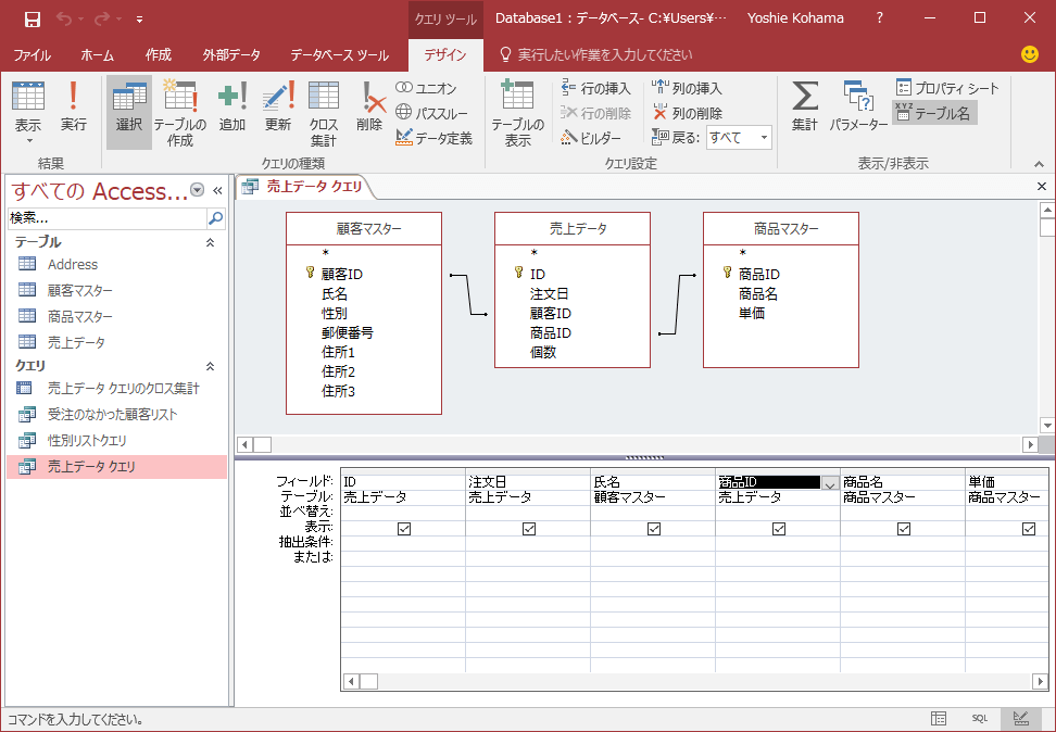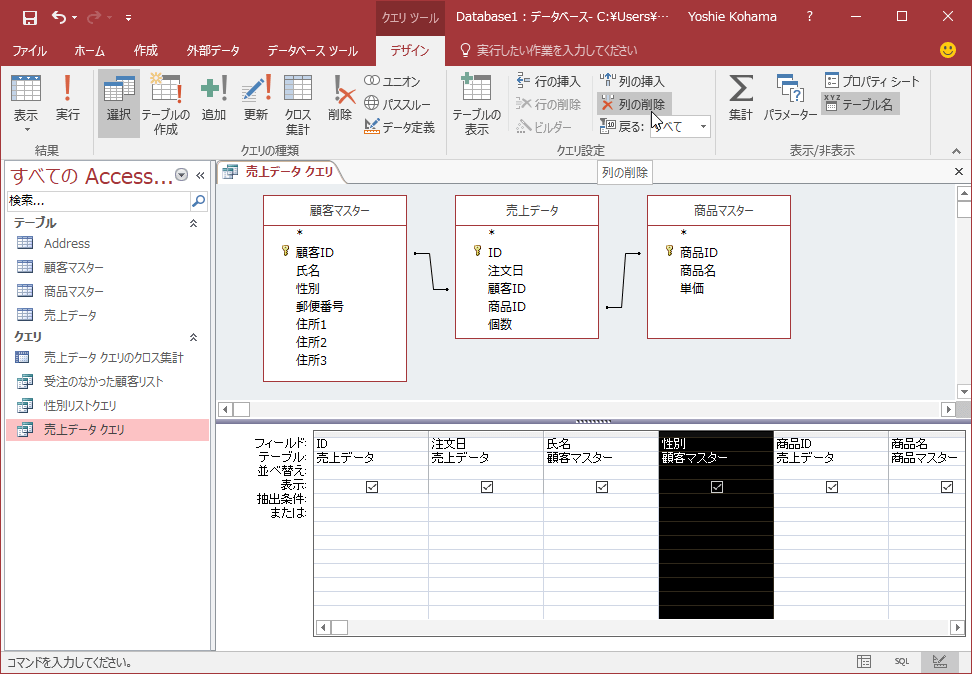 - [クエリツール]の[デザイン]タブ、[クエリ設定]グループの[列の削除]をクリックします。