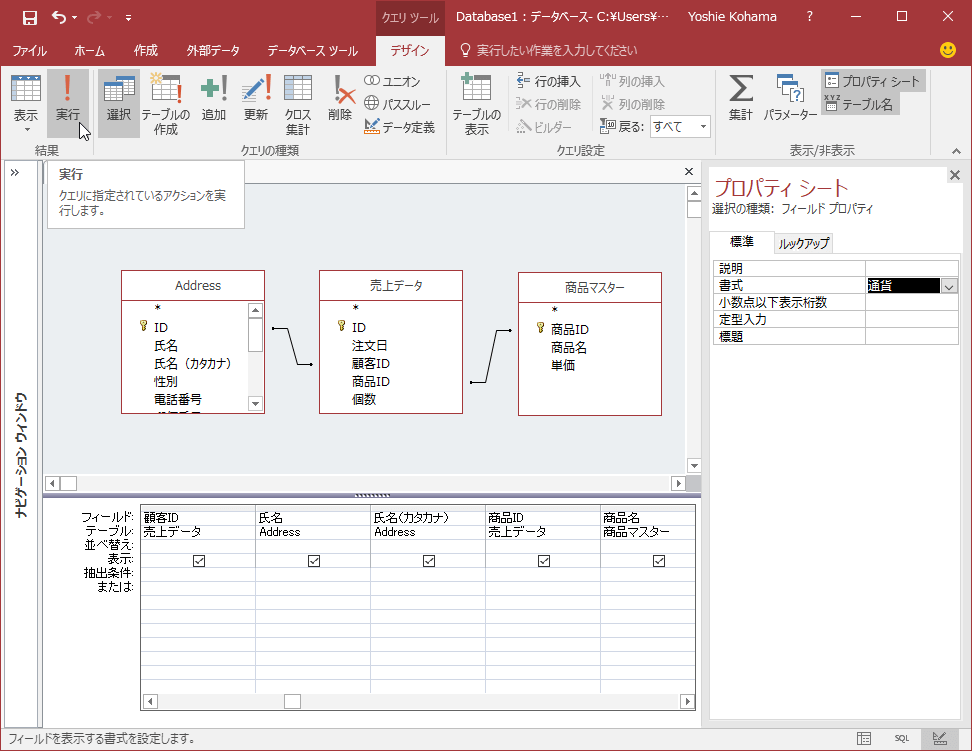 デザイングリッドのなかから書式を設定したいフィールドを選択して、[デザイン]タブの[表示/非表示]グループの[プロパティシート]をクリックします。