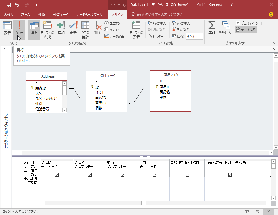 ここでは、小数点以下を切り捨てで[金額]フィールドの消費税8%を求めるフィールドを作成する方法について説明します。